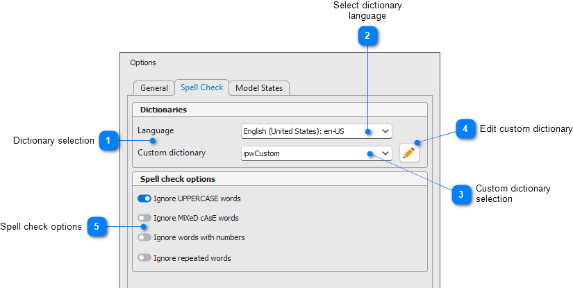 The default settings for spell checking property values are set in the iPropWiz Configuration Editor and stored in the iPropWiz configuration. In the iPropWiz Property Editor Option dialog, you can always override the Spell Check Options settings but access to dictionary settings is typically disabled. The following table outlines the spell check options in the PE.