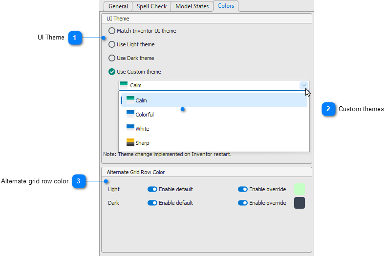 Users can override the default color theme for the iPropWiz UI. The default setting is to match the Inventor UI theme (Dark Mode or Light Mode). Users can opt to use one of these two themes regardless of the current Inventor UI theme, or they can select from a number of custom UI themes.