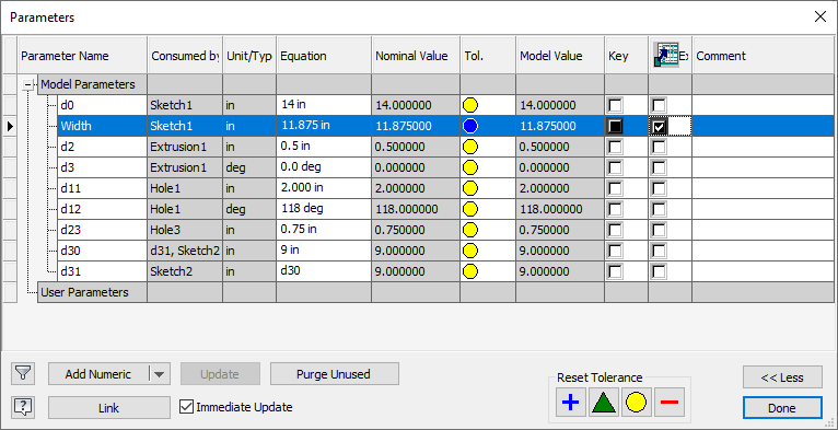 In Autodesk Inventor, the iPropWiz configuration containing the above setup information is active. The user opens the Autodesk Inventor Parameters dialog and checks the Export to Custom iProperty button for the Width model parameter. The user then clicks Done to close the dialog. Since the Width parameter has units of length, the Length-Small CPFR is used to generate an identical Autodesk Inventor CPFR for this exported property.