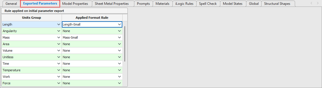 In the following image the Length-Small CPFR is selected as the CPFR to be automatically applied to all exported length type parameters (a parameter that has length units). No further action is required in the iPropWiz configuration. If this iPropWiz configuration is active and a user exports a length parameter to a custom iProperty in the Autodesk Inventor Parameters dialog, the custom iProperty will be formatted as defined in the Size rule.