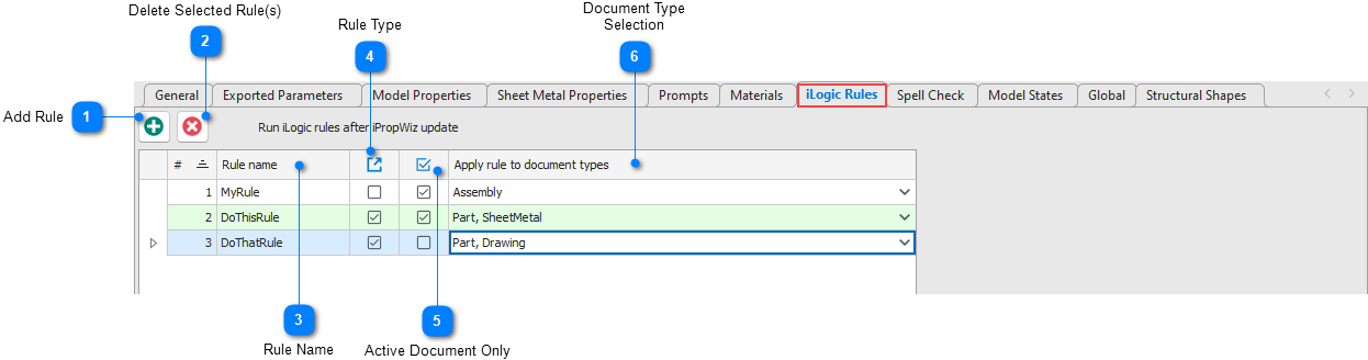 In the iPropWiz Configuration Editor, click the iLogic Rules tab in the Options group. Add the iLogic rules to run in the iLogic rules grid. See the Adding iLogic Rules section below for more information on creating and managing iLogic rules.