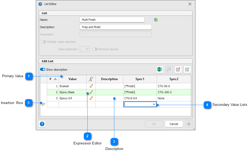 You use a Multi-property Text list to set the value for multiple secondary properties based on the selected list value for a primary property. The List Editor enables you to manage the primary and secondary values for each row in the list.