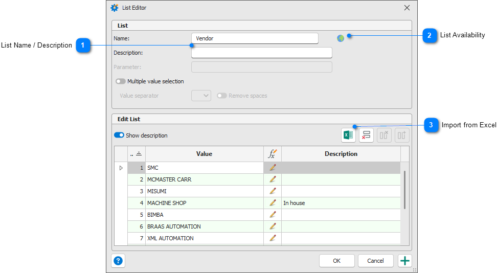 The List Editor adjusts to the list type currently being edited. In the following illustration, a simple value/description text list is shown in the following image. Common controls for all list types are highlighted.